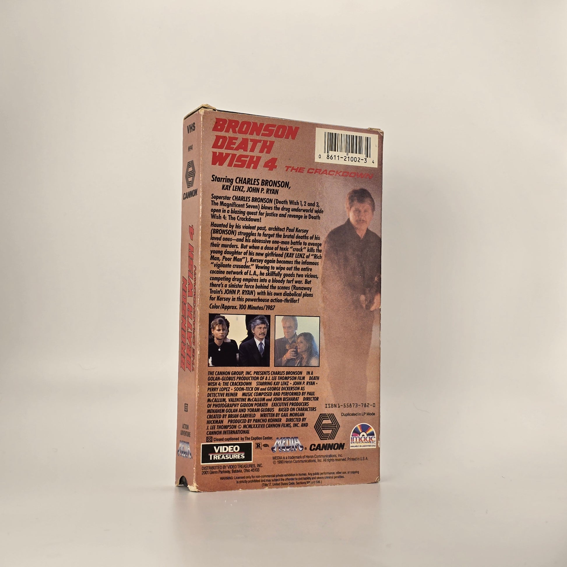 Death Wish 4: The Crackdown is a 1987 vigilante action sequel starring Charles Bronson in his signature role as architect-turned-street enforcer Paul Kersey. In this fourth installment, Kersey targets the drug empires destroying Los Angeles, launching a one-man war against rival gangs in an all-out bid to wipe out the cocaine trade. Packed with gritty urban settings, blunt-force action, and Bronson’s trademark stoic intensity, this entry leans hard into late-80s exploitation energy. Released by Cannon Films, a studio beloved by collectors for its unapologetic action output, this tape embodies the era’s no-holds-barred approach to crime cinema. Death Wish 4 is essential viewing for fans of revenge thrillers, Cannon completists, and collectors who appreciate raw, unfiltered VHS-era action. A cult favorite in the franchise, this title delivers exactly what the series is known for: street justice, explosive confrontations, and Bronson at his most relentless.