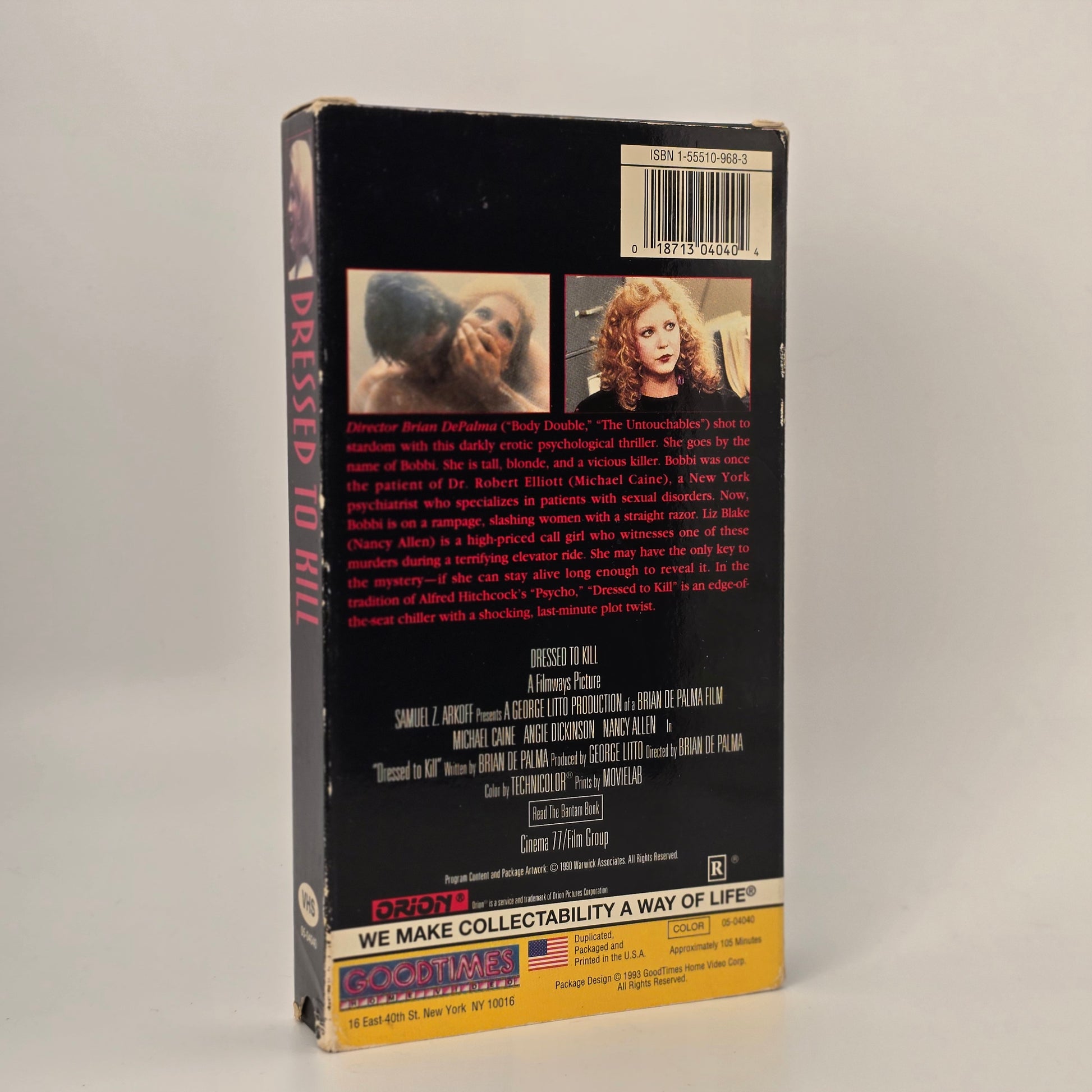 Brian De Palma’s stylish psychological thriller Dressed to Kill arrives on vintage VHS, a must for collectors of provocative 1980s suspense and cult cinema. Starring Michael Caine and Angie Dickinson, this neo-noir shocker blends Hitchcockian tension with De Palma’s signature visual flair, delivering one of the most talked-about thrillers of its era. Long appreciated by fans of erotic thrillers and classic horror-adjacent cinema, this tape captures the film’s original home video presentation and cover art that defined video store shelves in the late 80s and early 90s. A strong addition for collectors of De Palma, retro thrillers, and vintage VHS artwork, this release carries the gritty charm and shelf presence that make physical media so collectible. Whether displayed alongside other cult classics or added to a working VHS library, this is a memorable piece of genre filmmaking history preserved in its original analog format.