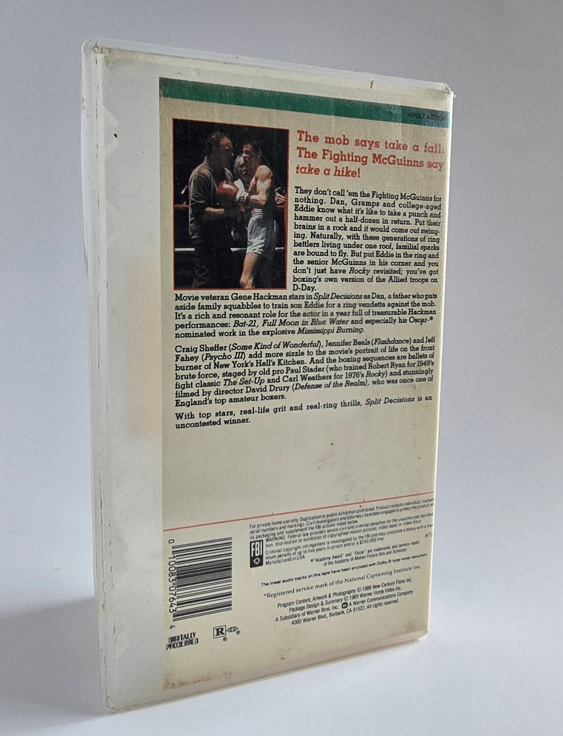 Own the original release of "Split Decisions" on VHS, a gripping 1988 sports drama starring Gene Hackman, Craig Sheffer, Jeff Fahey, and Jennifer Beals. Directed by David Drury, this film dives into the intense world of boxing through the McGuinn family. Gene Hackman delivers a powerful performance as Dan McGuinn, a former boxer training his sons. After the tragic death of his eldest son Ray (Jeff Fahey), younger son Eddie (Craig Sheffer) steps into the ring to seek redemption and honor his brother's legacy. "Split Decisions" explores themes of family loyalty, redemption, and the harsh realities of the boxing world. Praised for its emotional depth and compelling boxing scenes, this VHS is a must-have for fans of sports dramas and Gene Hackman. Add "Split Decisions" to your collection and experience the powerful narrative and stellar performances that make this film a classic.