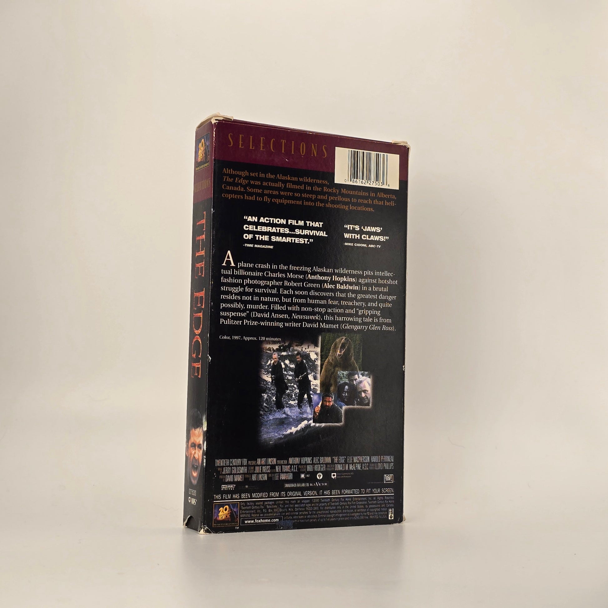 The Edge on VHS is a late-1990s studio thriller that has become increasingly appealing to collectors of wilderness survival films and prestige Hollywood VHS releases. Starring Anthony Hopkins and Alec Baldwin, this Fox Selections edition blends psychological tension, man-versus-nature survival, and sharp dialogue written by David Mamet. The film’s themes and stark imagery give it crossover appeal for collectors of thrillers, survival cinema, and actor-focused VHS libraries.